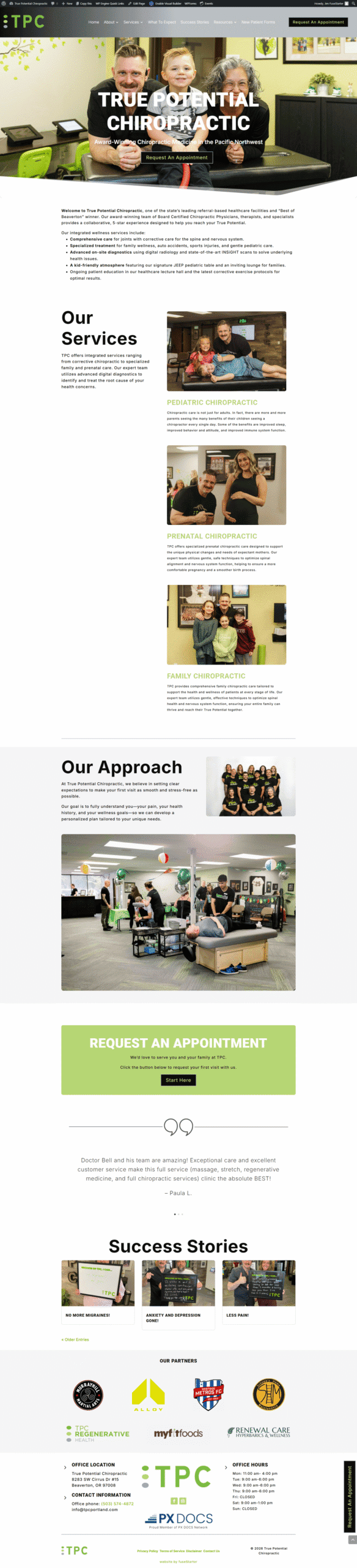 True Potential Chiropractic sought to establish a cutting-edge digital identity through a modern website redesign focused on elevating visual aesthetics and driving deeper patient engagement. By partnering with fuseStarter, they were able to translate this ambitious vision into reality, as the team expertly crafted a dynamic, high-impact online presence that effectively bridges the gap between professional clinical excellence and a seamless user experience.